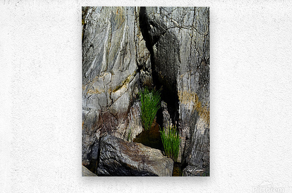 Amid the sheer, sculpted expanse of ancient granite, where the mountain's side bears the patient chisel of wind and time, a few defiant tufts of vivid emerald grass cling to life. Nestled in narrow crevices like jewels set in stone, these resilient clusters burst with improbable color against the cool gray rock—vibrant proof that nature finds a foothold even in the most unforgiving places. Their blades catch the light, glowing with quiet tenacity, whispering of persistence, renewal, and the delicate balance between fragility and unbreakable will. In this intimate portrait of endurance, the mountain itself seems softened, as if the grass has claimed its rugged canvas and painted hope across the stone.