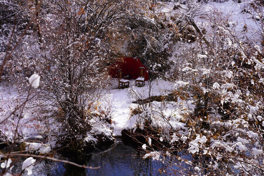 Two dining room chairs set up on the banks of Spanish Creek in the winter.