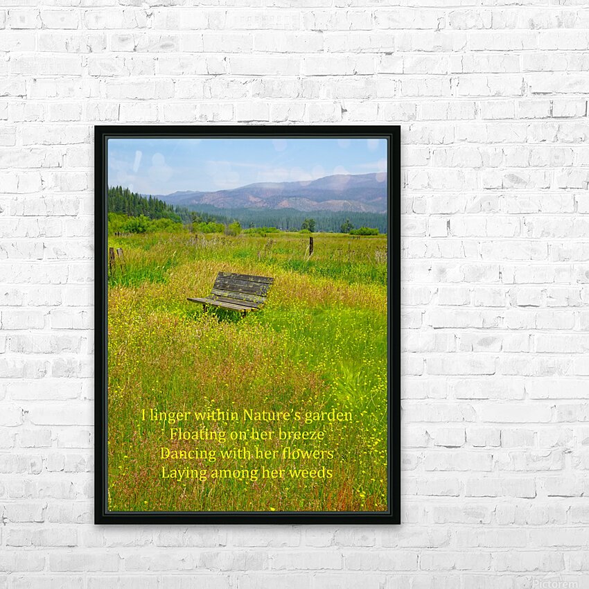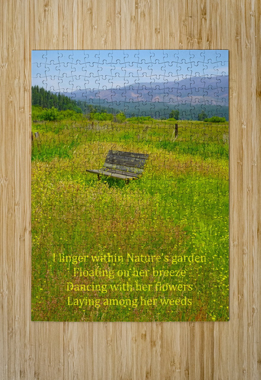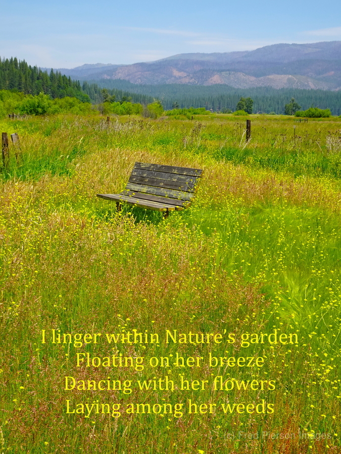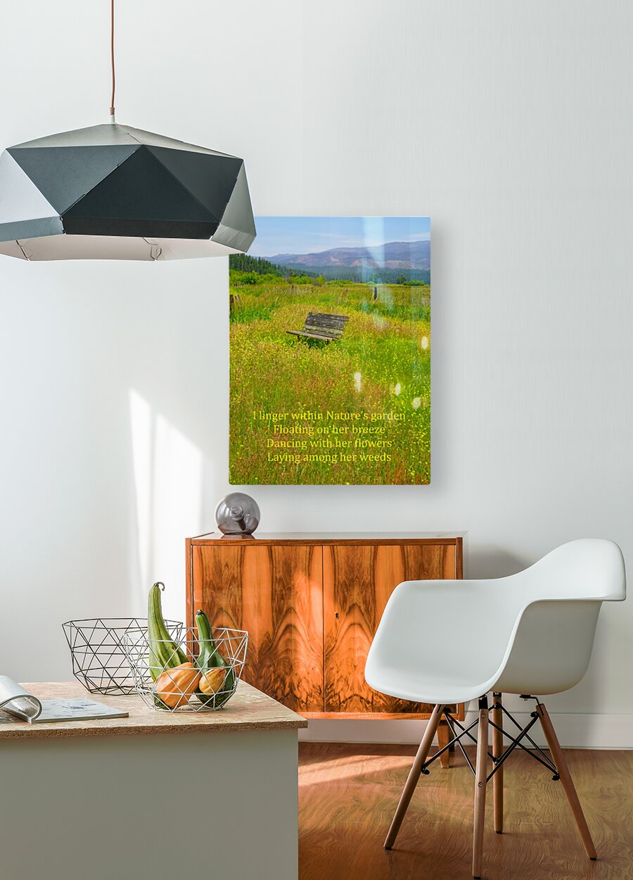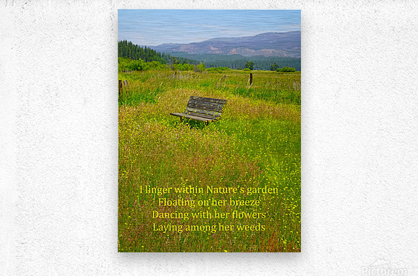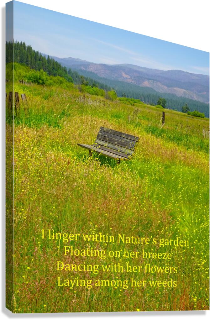 The world can get a bit hectic and crazy at times to the point where you don’t want anything to do with it. I was feeling a bit that way when I took my walk one day. I decided to take a different route than normal and I am glad that I did because I came across this ideal spot to just sit and look at all of nature around me. All of the hectic crazy world just dematerialized and I was just me being me. The spot was so ideal that I decided that I would need to get a great photograph of this place so that anyone looking at the scene could do the same. When my daughter Miranda Clarity saw the photograph, she wrote a poem called Nature’s Garden and so the photograph was named. Here is her poem: I linger within Nature’s garden, Floating on her breeze, Dancing with her flowers, Laying among her weeds.